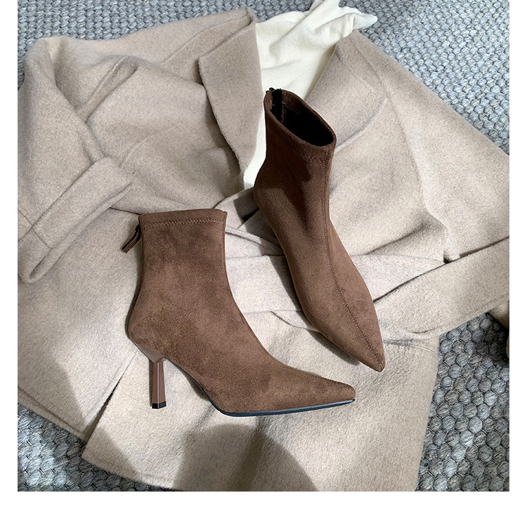 スエード素材が魅力のエレガントなショートブーツ。細めのヒールと伸縮性のある生地が絶妙な履き心地を提供し、足首にしっかりフィットするショート丈が特徴です。つま先がとがったデザインは、脚長効果を引き出し、スタイリッシュな印象を与えます。普段使いや特別な日にもぴったりな一足で、コーディネートを格上げします。